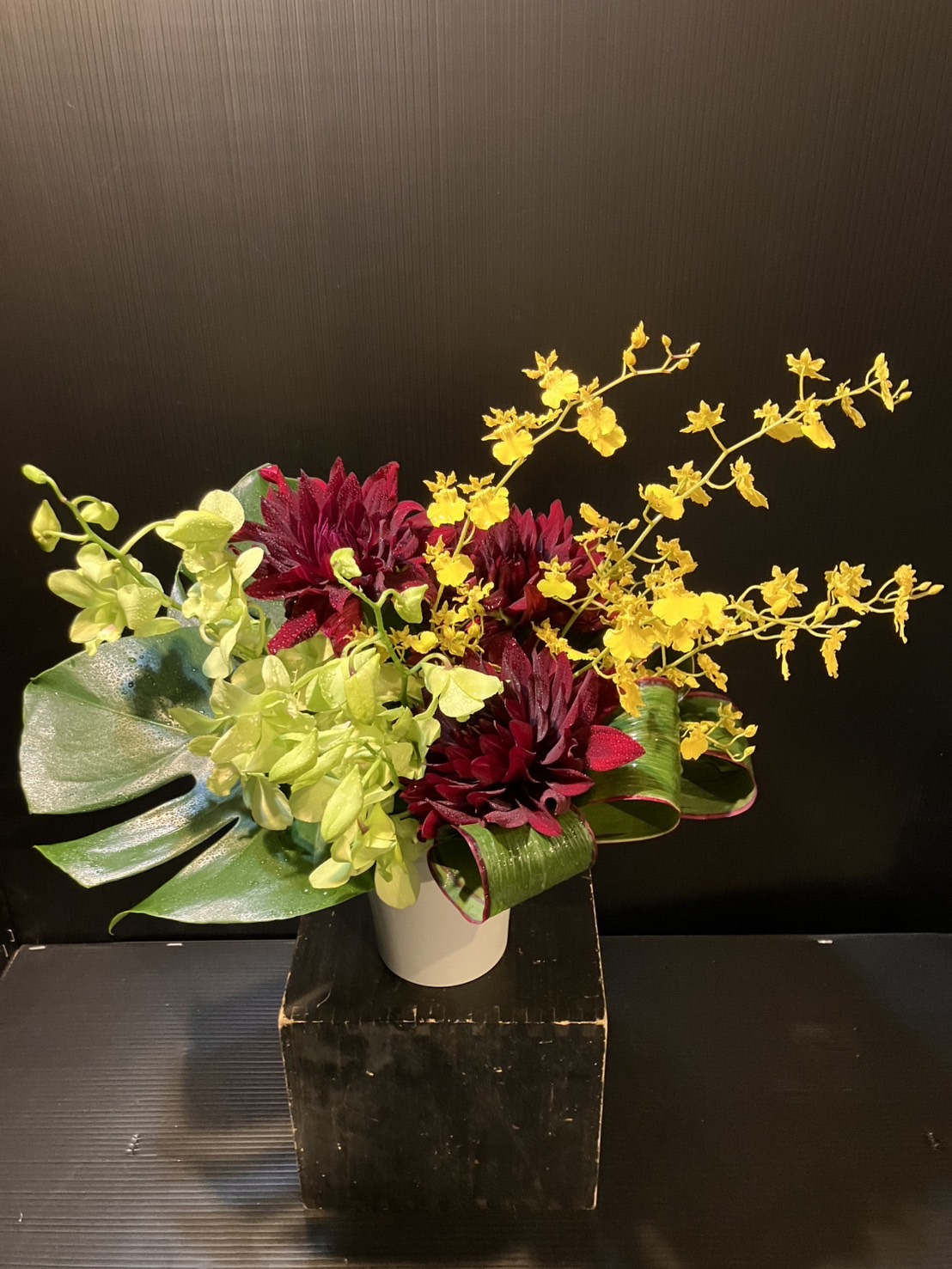 個性を感じさせる佇まいの若い男性へとお伺いしましたので、ダリアを中心に右に黄色のオンシジウム、左に緑のデンファレを固め少し個性的にお作りいたしました💐✨