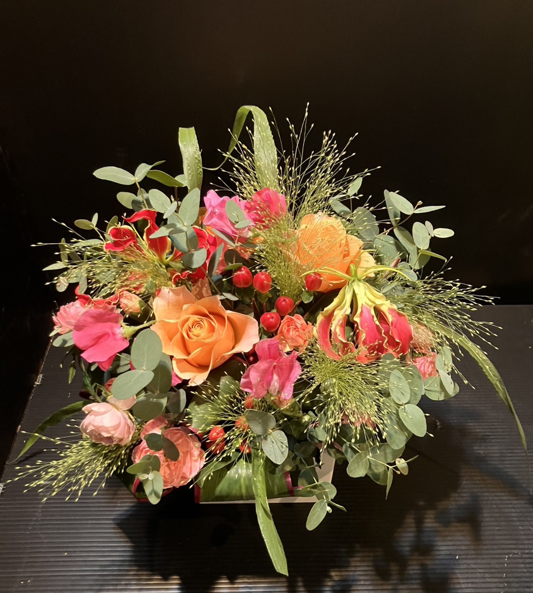 赤やオレンジ色のお花を使い、スモークグラスやユーカリの葉で躍動感が出るようお作りしました💐✨